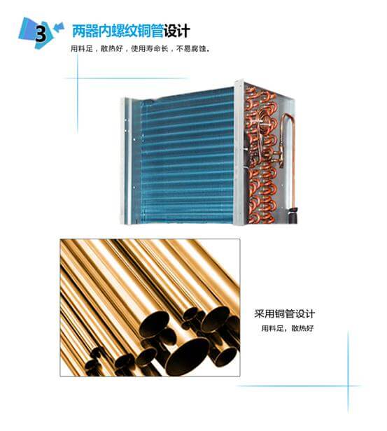 由風扇將潮濕空氣吸入機內(nèi),通過壓縮機制冷系統(tǒng)將蒸發(fā)器表面降到空氣的露點溫度以下,此時潮濕的空氣經(jīng)過蒸發(fā)器時,空氣中的水會分解出來并附在蒸發(fā)器表面(注:就像夏天我們從冰箱拿出一瓶水,一會瓶子的外面有一層冷凝水一樣的原理),水會順著蒸發(fā)器上的親水箔到積水托盤再流到水箱或排水管排出,除濕過的干燥冷空氣經(jīng)過冷凝器加熱后排出機外,如此循環(huán)使內(nèi)外溫度降低。